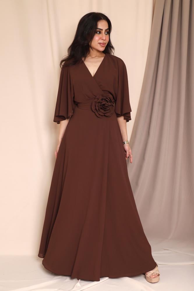 فستان بفتحة صدر وحزام مع وردة على الخصر